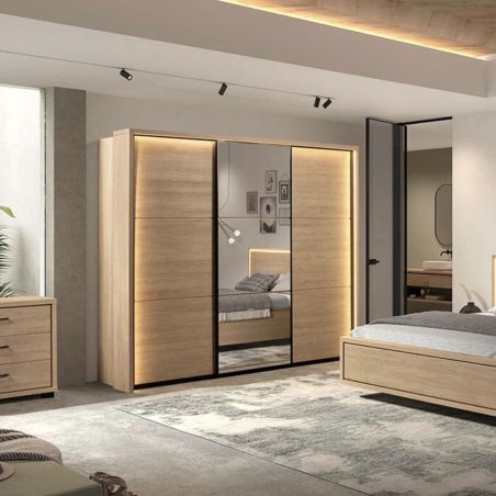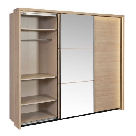 Armoire 3 portes coulissantes avec miroir et leds aspect bois et noir - LUDY.