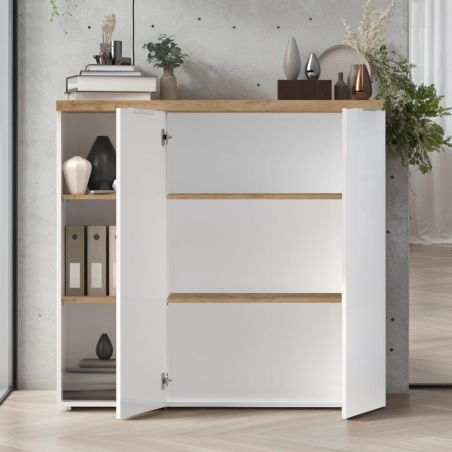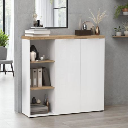 Rangement 2 portes avec niches blanc laqué brillant dessus aspect bois finition Cadiz - GENIUS.