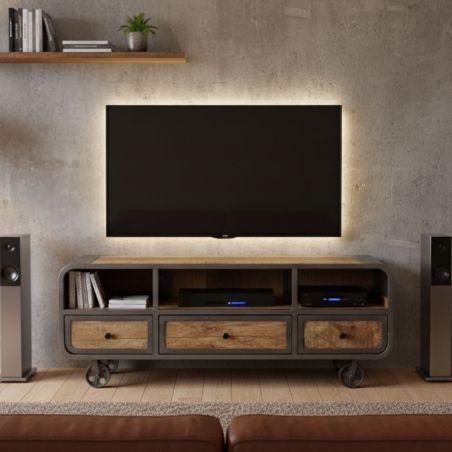 Apportant une touche industrielle atypique à votre salon, ce meuble TV dispose d'un large plateau, combiné à 3 tiroirs de rangement ainsi qu'une large niche.