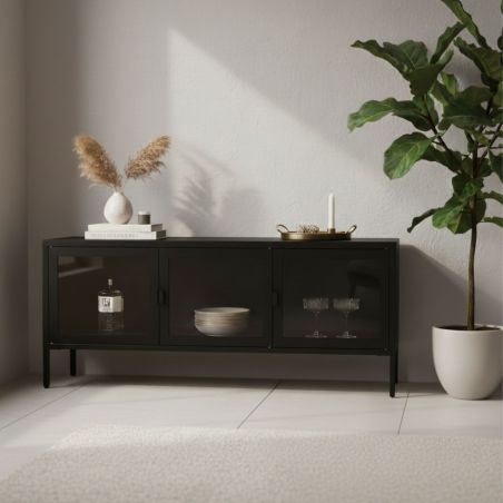 Meuble TV 3 Portes Verre et Acier Noir de la gamme Hendra.