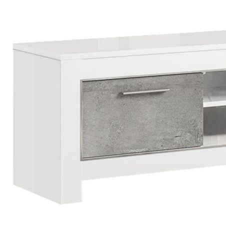 Meuble TV 2 Portes L160cm Laqué Blanc Brillant et Gris Marbré de la gamme Denae.