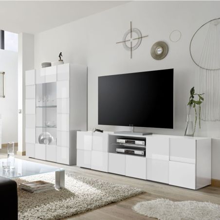 Meuble TV 181 cm Finition Blanc Laqué Weiss Relief Damiers et Leds de la gamme Rebecca.