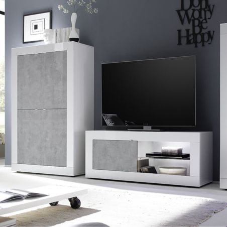 Meuble TV 1 Portes 2 Niches Blanc Laqué et Aspect Béton avec Leds de la gamme Otello.