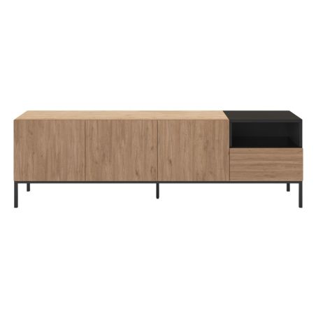 Meuble TV 3 portes en mélaminé imitation bois et noir piètement métal laqué noir - CALLAS.