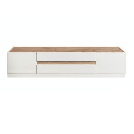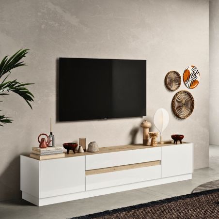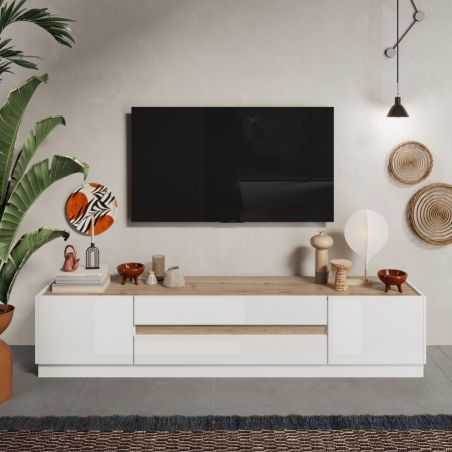 Meuble TV 2 portes 2 tiroirs laqué blanc plateau et détail façade aspect bois finition Cadiz - FANASY.