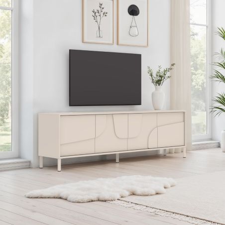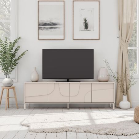 Meuble TV 4 portes laqué beige façade relief piètement métal - EGERIE.