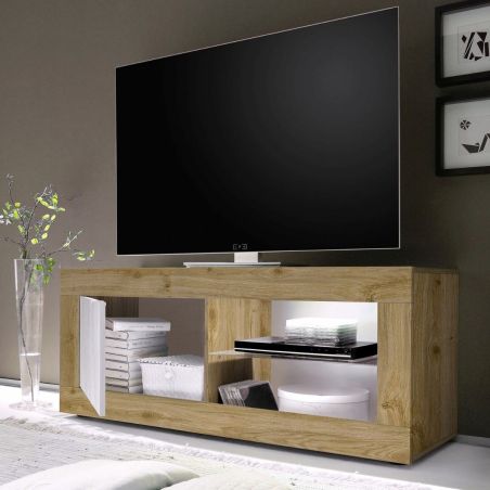 Meuble TV 1 portes 2 niches aspect bois finition Cadiz façades blanc texturées avec Leds - OTELLO.