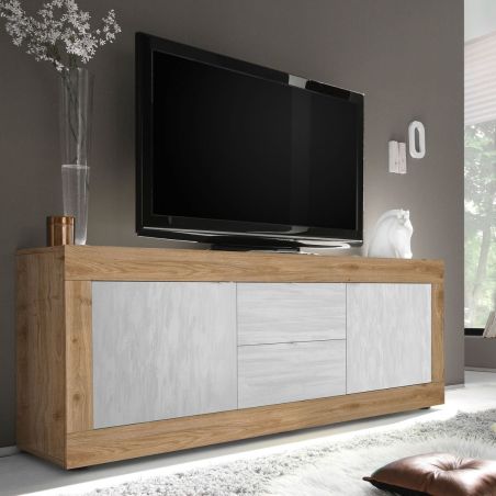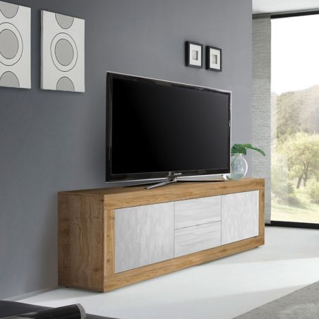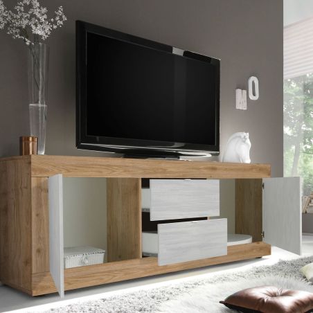 Meuble TV 2 portes 2 tiroirs aspect bois finition Cadiz façades blanc texturées - OTELLO.
