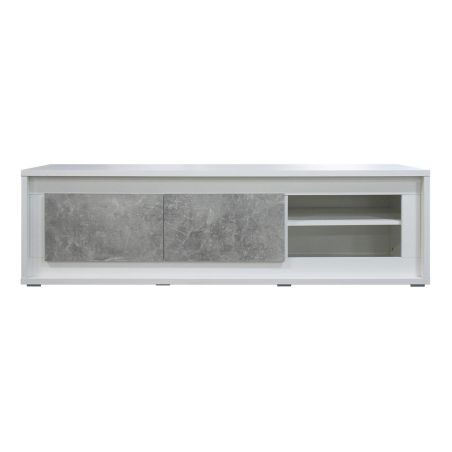 Meuble TV 2 portes laqué blanc façades effet béton avec éclairage Led.