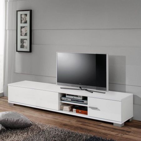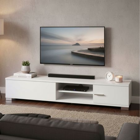 Ce meuble TV se distingue par ses lignes épurées et sa finition d'un blanc immaculé, idéale pour créer une atmosphère lumineuse et sereine dans votre espace de divertissement.
