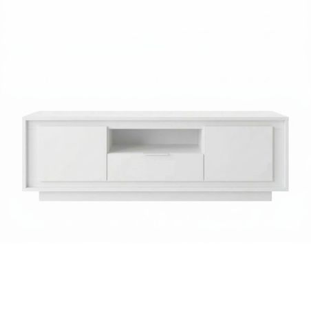 Meuble TV 2 portes 1 tiroirs 1 niche blanc laqué piètement socle - AZONTO.