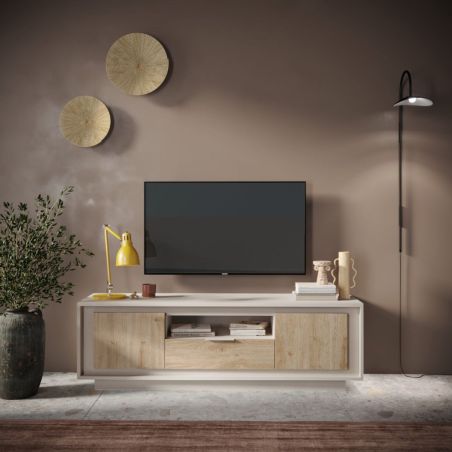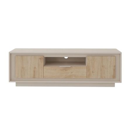 Meuble TV 2 portes 1 tiroirs 1 niche beige poudré façades aspect bois finition Cadiz piètement socle - AZONTO.