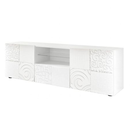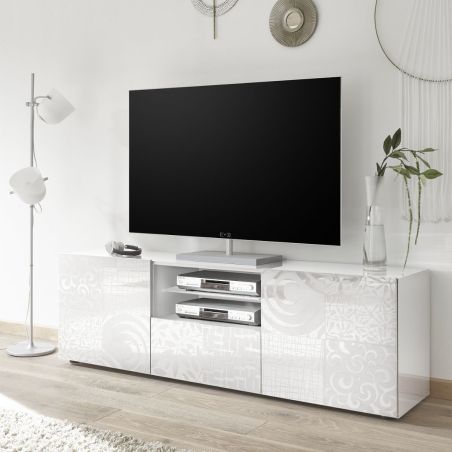 Meuble TV 2 portes blanc laqué sérigraphies multi-motifs - JUAN.