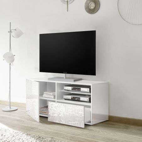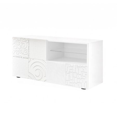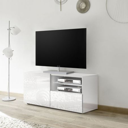 Meuble TV 1 porte blanc laqué sérigraphies multi-motifs - JUAN.
