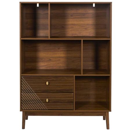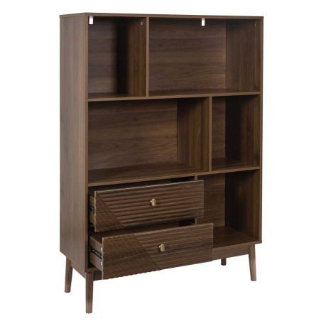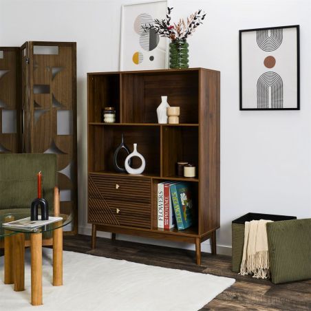 Bibliothèque 2 tiroirs 5 niches en bois et MDF pieds en pin teinté chêne foncé de la gamme Colette.