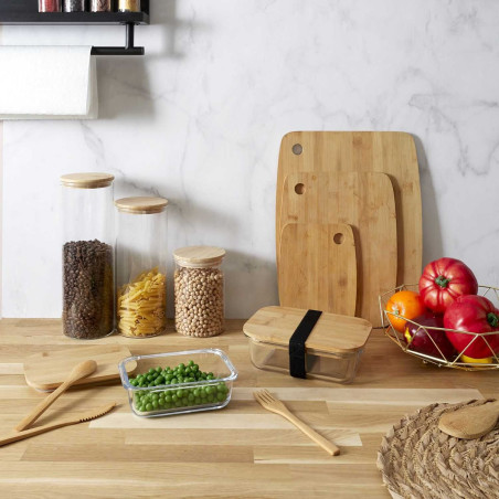 Bocal en verre borosilicate, couvercle en bambou, joint en silicone. Haute résistance thermique et chimique, grande durabilité.