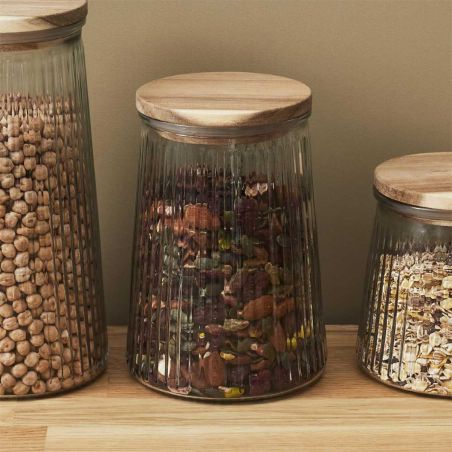 Bocal en verre de 95cl avec bouchon en acacia, parfait pour stocker et présenter vos aliments secs comme riz, farine et graines.