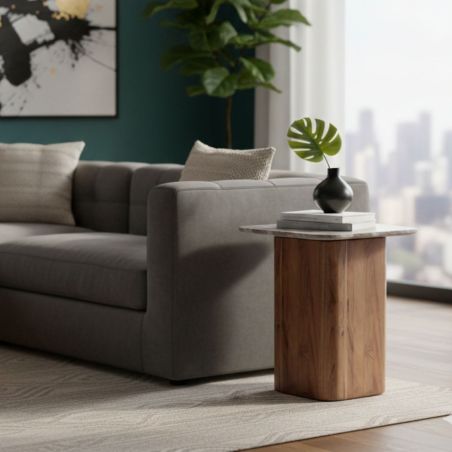 Bout de Canapé Plateau Marbre Naturel Piètement Acacia de la gamme Angele.