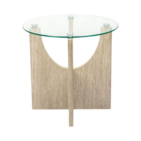 Table d'appoint Ø45cm plateau verre et piétement en MDF aspect travertin - VERTINA.