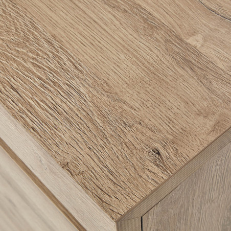 Structure en panneau de particules, finition papier décor chêne français. Portes et tiroirs avec systeme de fermeture Softclose. Pieds en plastique noir.
