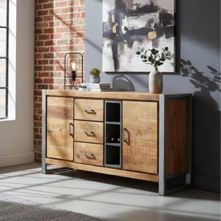 Buffet avec 2 Portes et 3 Tiroirs Bois et Acier Patiné de la gamme Palissa.