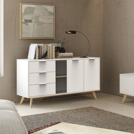 Buffet 165cm 2 Portes 3 Tiroirs Scandinave MDF et Pin Massif Naturel et Blanc de la gamme Blajk.