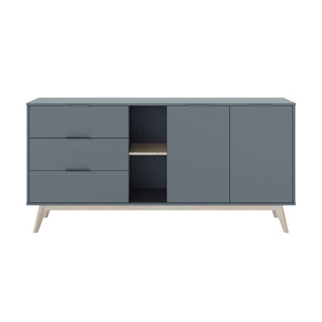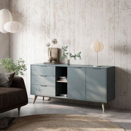 Buffet 165cm 2 Portes 3 Tiroirs Scandinave MDF et Pin Massif Gris Vert de la gamme Canaca.
