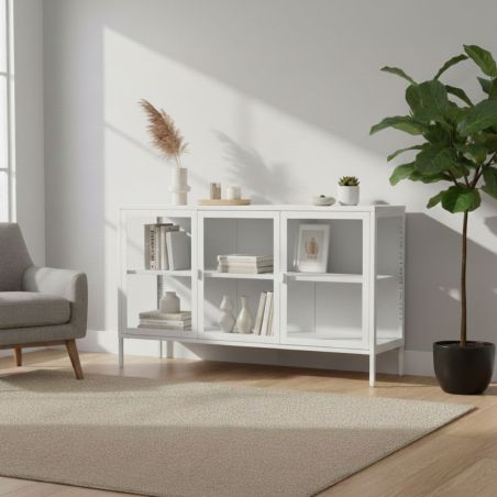 Buffet 3 Portes Verre et Acier Blanc de la gamme Hendra.