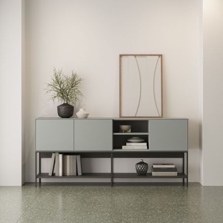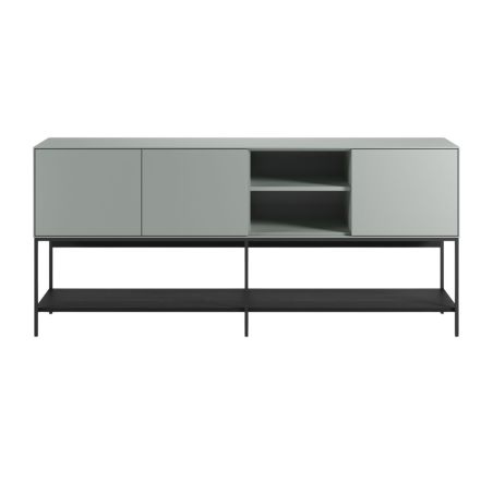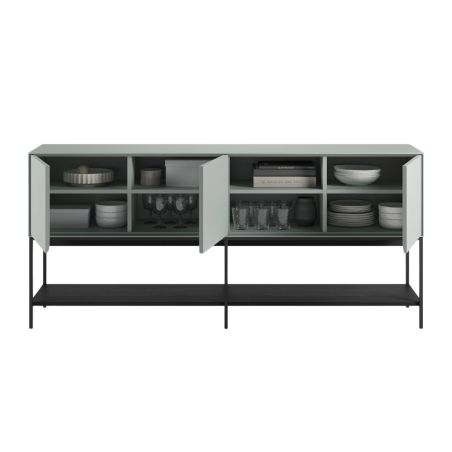 Buffet 3 portes 1 niches en mélaminé vert sauge et piètement avec étagère en métal laqué noir - MIRINA.