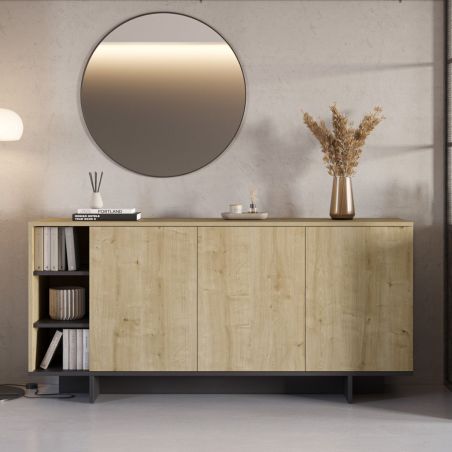Buffet 3 portes 3 niches 170cm en mélaminé imitation bois et noir - ESQUISSE.