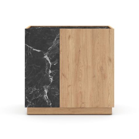 Son design combine un aspect imitation chêne clair très réaliste avec un insert central et un plateau en finition marbre noir veiné. Ce contraste crée un effet visuel saisissant, parfait pour les décors modernes.