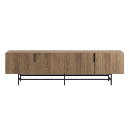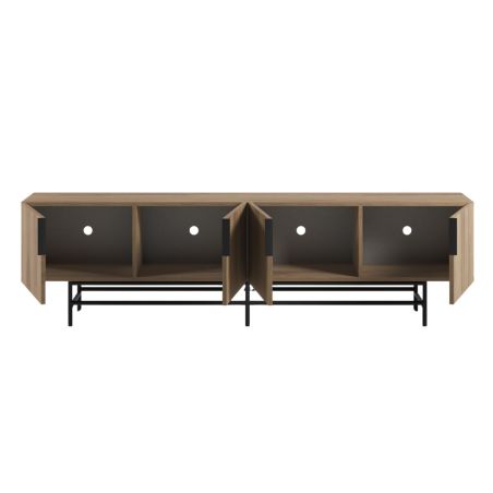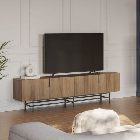 Meuble TV 4 portes en mélaminé imitation bois et piètement et poignées en métal laqué noir - ALDINE.