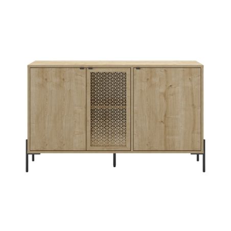 Buffet 3 portes en mélaminé imitation bois clair avec 1 porte sculptée piètement métal noir - MELISSA.