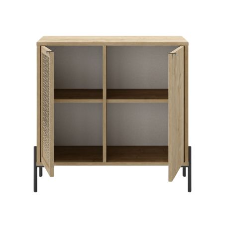 Meuble de rangement 2 portes en mélaminé imitation bois clair avec 1 porte sculptée piètement métal noir - MELISSA.