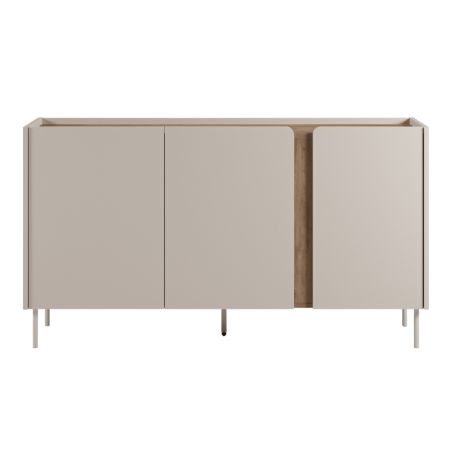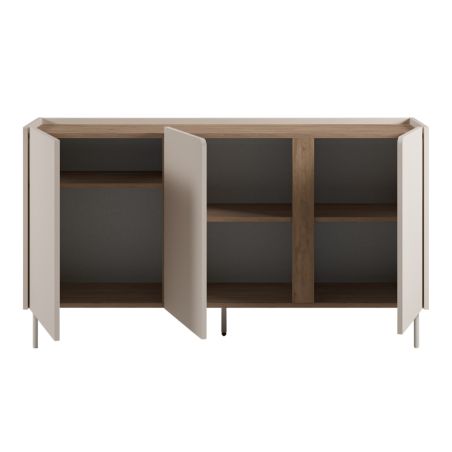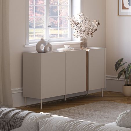 Buffet 3 portes 150cm en mélaminé beige et imitation bois avec découpe graphique bandeau - LIWENN.