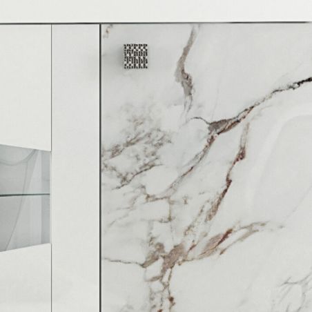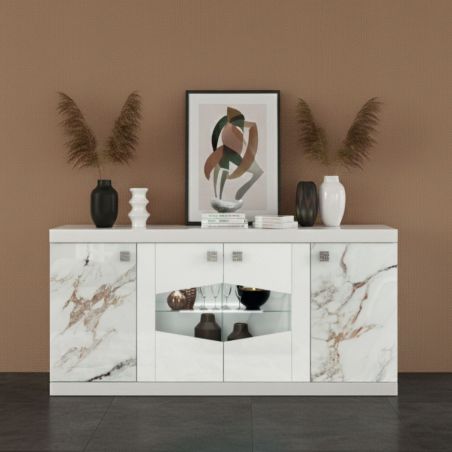 Buffet 4 portes avec leds et portes centrales vitrées laqué blanc et imitation marbre - ETOLIS.