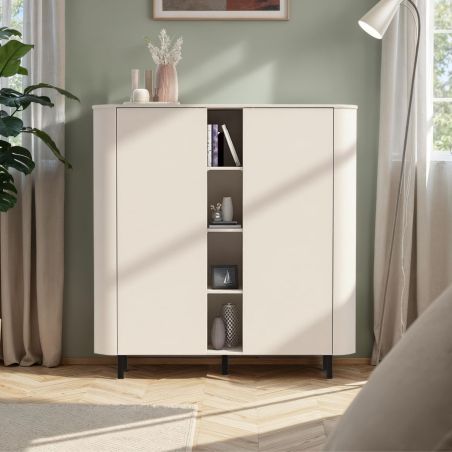 Meuble de rangement 2 portes et niches finition laqué beige design coins arrondis pieds métal noir - LYNA.