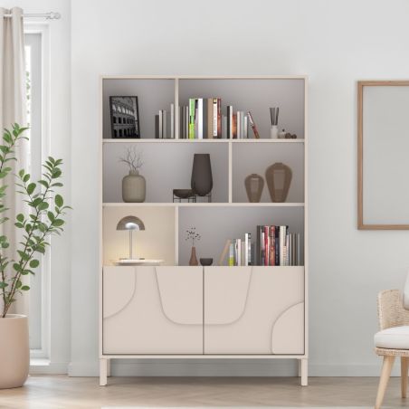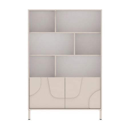 Meuble de rangement étagères 2 portes laqué beige façade relief piètement métal - EGERIE.