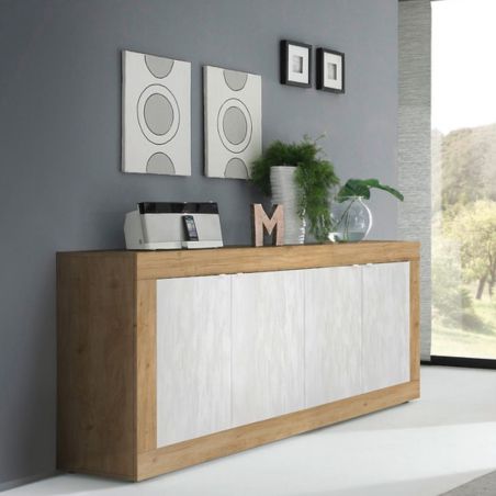 Buffet 4 portes aspect bois finition Cadiz façades blanc texturées - OTELLO.