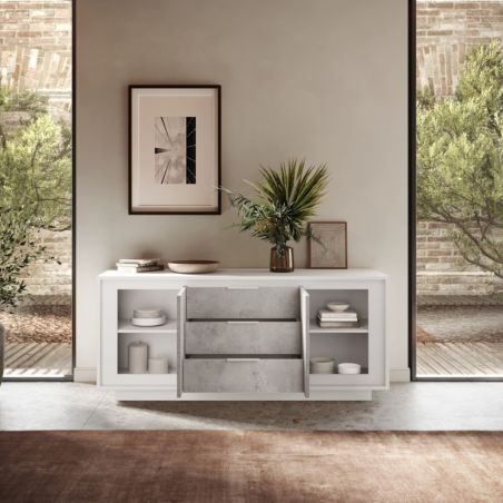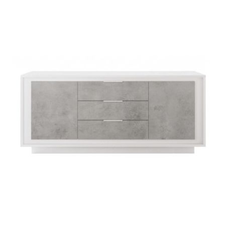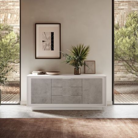 Buffet 2 portes 3 tiroirs blanc laqué façades aspect ciment piètement socle - AZONTO.