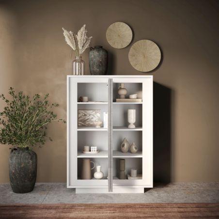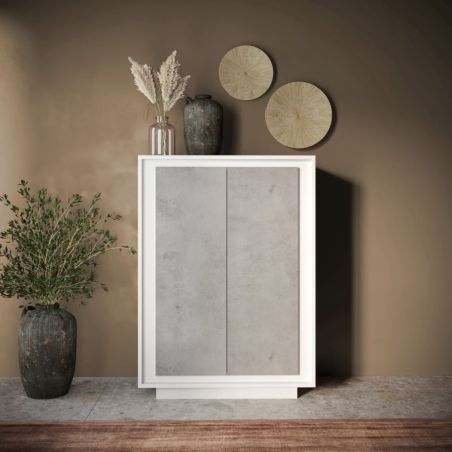 Rangement 2 portes blanc laqué façades aspect ciment piètement socle - AZONTO.