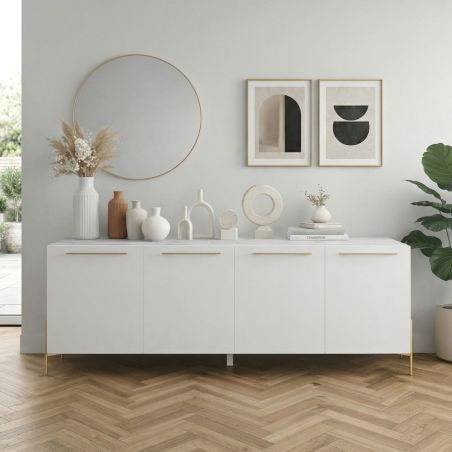 Buffet 4 portes laqué blanc plateau marbré pieds et poignées métal doré - CARAT.