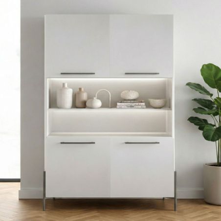 Buffet haut 4 portes laqué blanc pieds et poignées métal anthracite + Leds - CARAT.