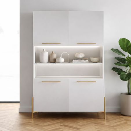 Buffet haut 4 portes laqué blanc plateau marbré pieds et poignées métal doré + Leds - CARAT.
