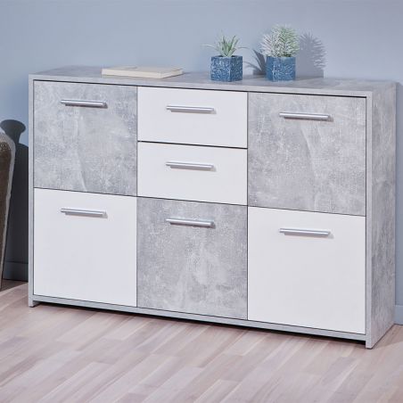 Meuble 5 Portes 2 Tiroirs Imitation Béton et Blanc Marry.