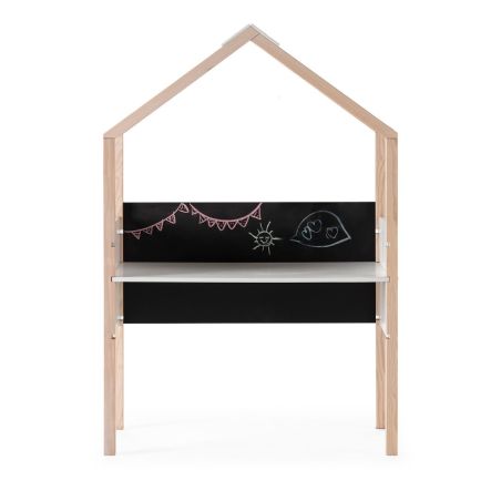 Bureau forme cabane en pin naturel et MDF laqué blanc avec plateau hauteur réglable et tableau ardoise - ROXY.