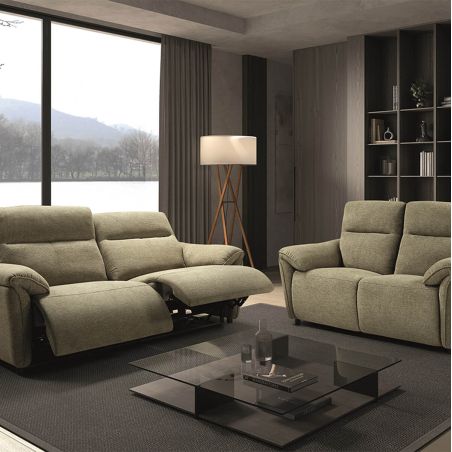 Structure en bois massif et assise ressorts. Revêtement en tissu microfibre polyester, rembourrage assises mousse densité 28kg/m3, dossiers et accoudoir en fibre creuses siliconées.