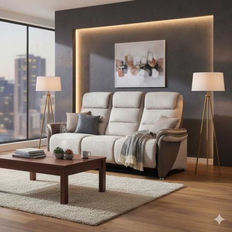 Canapé 3 places fixe tissu polyester micro peau brun et mastic avec tablette centrale imitation noyer - NADIR.