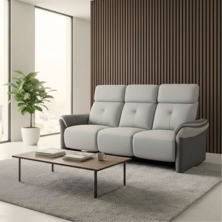 Canapé 3 places fixe tissu polyester micro peau gris perle et gris plomb avec tablette centrale imitation noyer - DJINO.