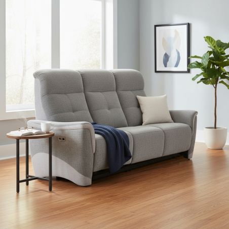 Canapé 3 places relax électrique tissu maillé polyester ultra doux bi-colore gris avec tablette centrale - AUSTRAL.